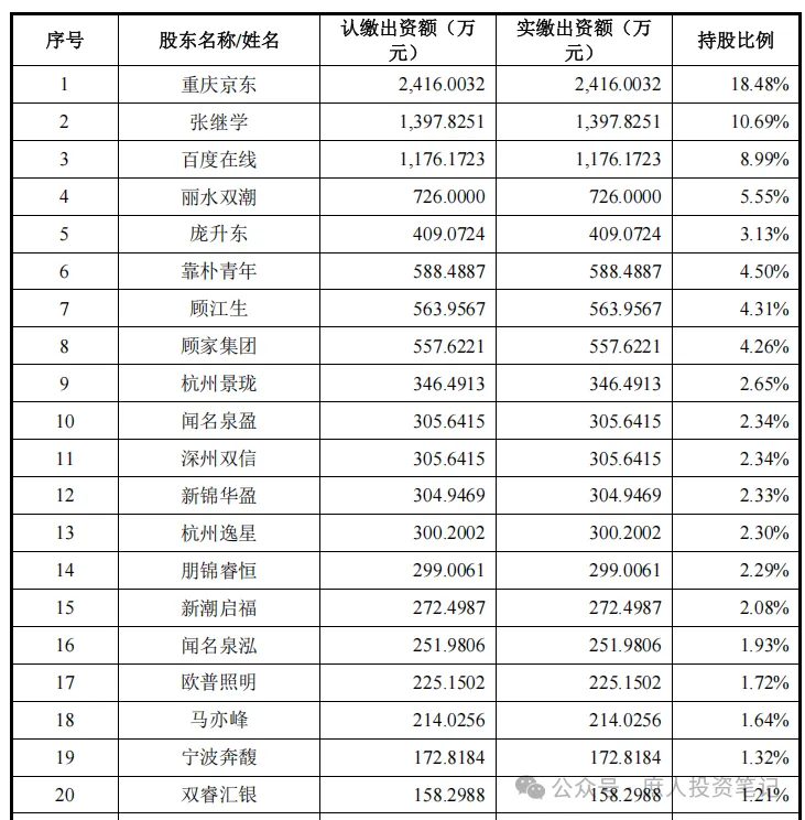 这些投资者中,有大家耳熟能详的百度、京东、顾家家居(包括顾江生以个人名义入股的)、欧普照明、红星美凯龙、好未来等产业资本,也有杭州桦茗、杭州景宸、杭州金投、杭州园景等私募股权,也有李景霞、朱琳等不知是哪路神仙的个人投资者。见下图: