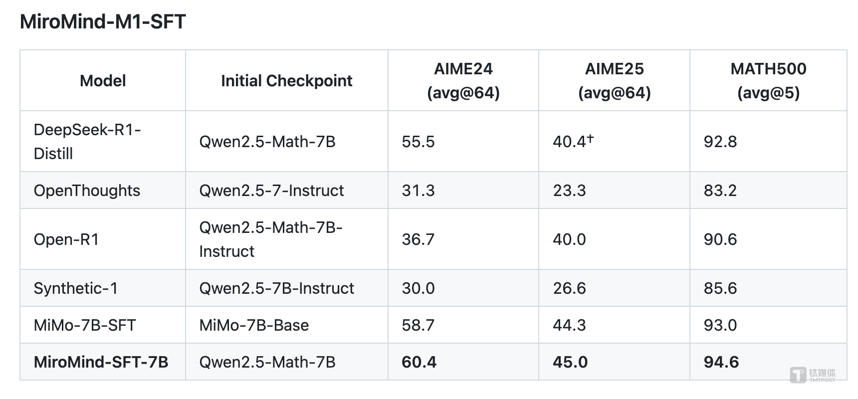 在AIME24、AIME25和MATH500上,MiroMind-M1-SFT版和MiroMind-M1-RL(强化学习)版本都取得了最佳性能,数学能力超越了DeepSeek-R1蒸馏版和小米的MiMo-7B-Base。