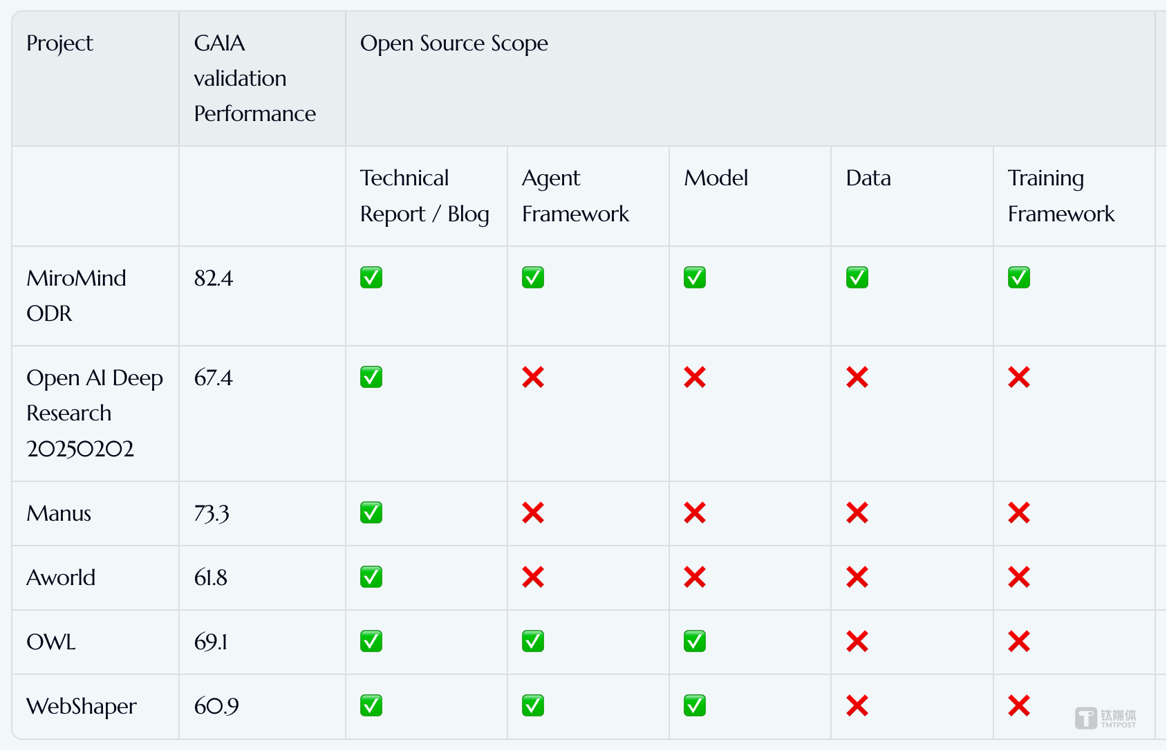 8月10日消息,代季峰领衔的MiroMind AI团队日前公布了一个高性能、完全开源、开放协作的深度研究项目MiroMind Open Deep Research(Miro ODR),其V0.1版本的GAIA测试达82.4分,性能超越OpenAI的DeepResearch、Manus等一众开源和闭源AI深度研究模型,从而成为当前开源最强Deep Research模型。