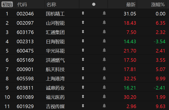 【竞价看龙头】财联社8月11日电,市场焦点股国机精工(5板)平开,水利基建板块山河智能(15天9板)高开6.35%、汇通集团(4天2板)高开2.32%,液冷IDC概念股日海智能(4板)低开3.54%,电力股华光环能(4板)高开2.41%,新疆本地股洪通燃气(4板)高开3.55%,商业航天概念股航天科技(4天3板)高开5.07%、上海港湾(2板)竞价涨停,创新药概念股诚意药业(5天3板)低开2.41%、福元医药(6天3板)高开1.99%,影视股吉视传媒(5天3板)高开9.63%。