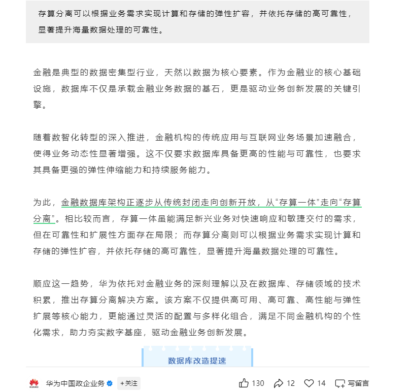 其实华为在金融领域早已对从“存算分离”有过描述 而且华为描述了存算一体三大缺点: 首先,存算一体架构无法实现存储和计算资源的独立扩展,两者必须同步扩展导致资源利用率低下; 其次,存算一体架构中任意单节点的计算或存储故障都可能引发数据丢失和业务中断,带来业务连续性风险; 第三,存算一体架构下,随着集群节点的增加,各类数据库的容灾、备份和日常运维等工作量呈指数级增长。 存算分离三大优势: 首先,存算分离架构通过将计算和存储分离部署,让资源扩展更加灵活,提升资源利用率;专业存储高达6个9的可靠性,可减