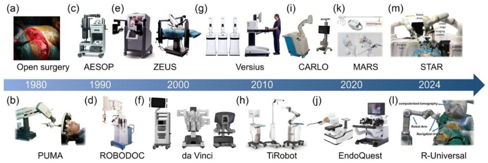 传统手术机器人自20世纪90年代问世以来,已经在提升手术精度、降低创伤风险、缩短术后恢复时间等方面展现出巨大优势。最具代表性的系统是美国直觉外科公司推出的“达芬奇”手术机器人,该系统通过医生操控机械臂完成精细手术操作,在1997年首获美国食品药品监督管理局批准用于内窥可视化和组织牵开,2000年扩展至普通外科手术,获得广泛临床认可。
