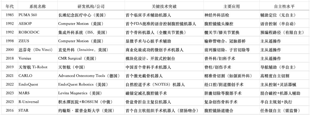 图3:手术机器人系统(SRS)发展里程碑丨图源/表格:作者整理自参考文献[3]