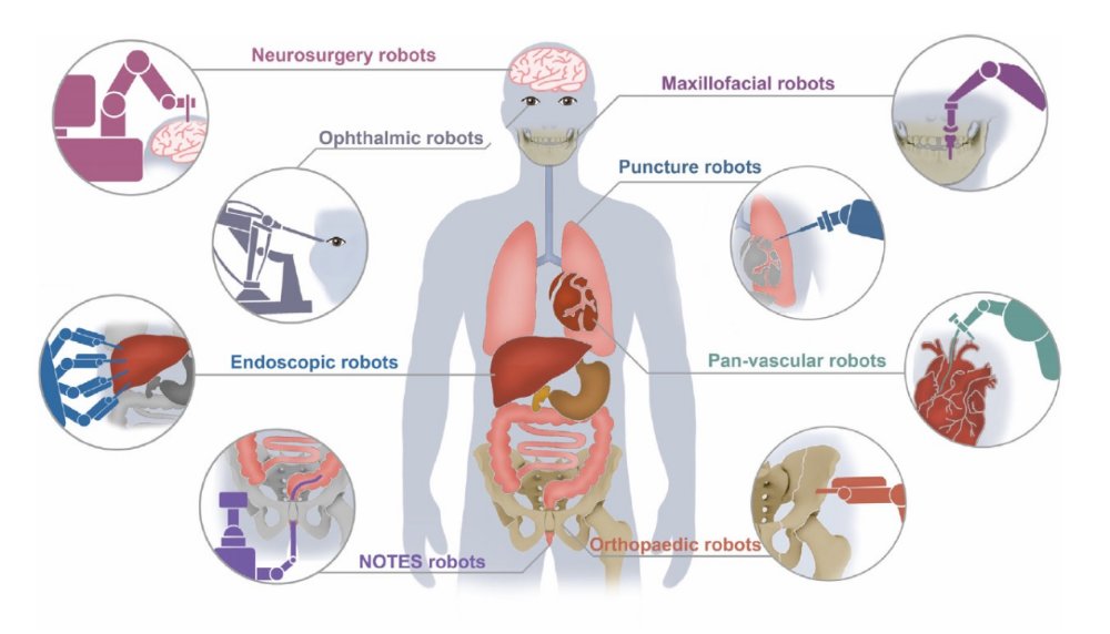 图6:手术机器人的应用领域。神经外科机器人(Neurosurgery robots)主要用于脑部手术;眼科机器人(Ophthalmic robots)应用于眼部手术;内镜机器人(Endoscopic robots)可用于如肝脏等部位的内镜手术;NOTES机器人(NOTES robots)适用于经自然腔道内镜手术;骨科机器人(Orthopaedic robots)用于骨骼相关手术;泛血管机器人(Pan-vascular robots)用于血管相关手术;穿刺机器人(Puncture robots)可进行穿刺操作;颌面机器人(Maxillofacial robots)用于颌面部位手术。丨图源:参考文献[3]