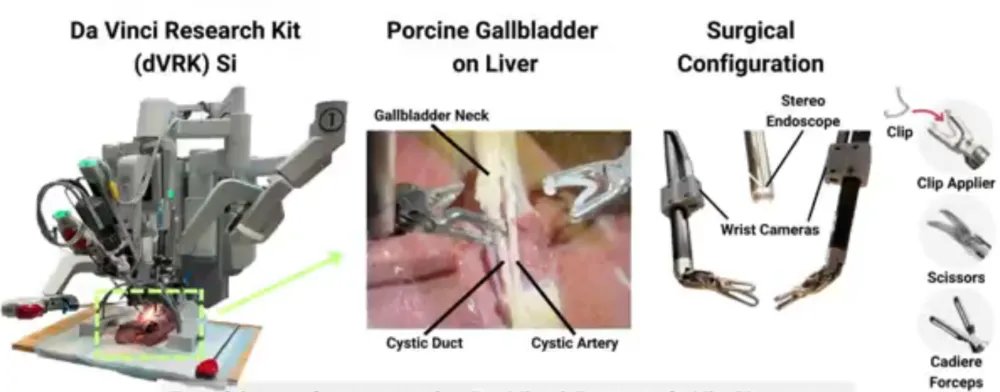 图1:以达芬奇手术机器人为执行系统的SRT-H自主完成切除离体猪胆囊手术。图从左到右依次为:达芬奇手术套件系统Si、与肝脏相连的猪胆囊、手术配置(立体内窥镜、腕部摄像头、施夹钳、施夹器、剪刀、卡尔迪钳)。丨图源:参考文献[1]