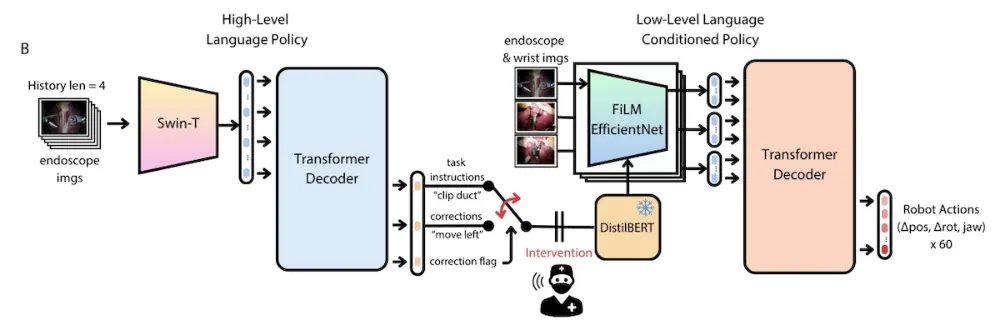 图2:SRT-H的双层“大脑”:语言规划器通过“校正标记”在任务指令和校正指令之间切换,而底层控制器则将选定的指令转化为精确的器械路径。丨图源:参考文献[1]