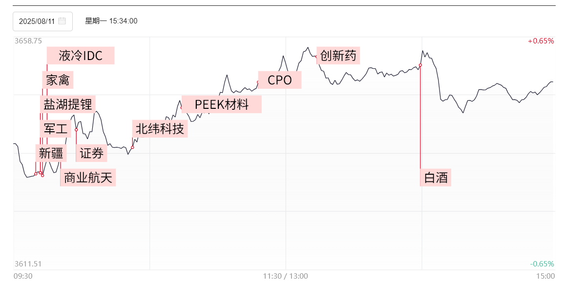 财联社8月11日讯,今日共78股涨停,连板股总数17只,28股封板未遂,封板率为73%(不含ST股、退市股)。军工股长城军工8天6板,机器人概念股北纬科技6天5板,商业航天概念股航天科技5天4板、上海港湾3连板,PEEK材料概念股中欣氟材5天4板。沪深两市全天成交额1.83万亿,较上个交易日放量1167亿。板块方面,PEEK材料、锂矿、CPO、PCB等板块涨幅居前,银行、黄金、影视、工程机械等板块跌幅居前。截至收盘,沪指涨0.34%,深成指涨1.46%,创业板指涨1.96%。