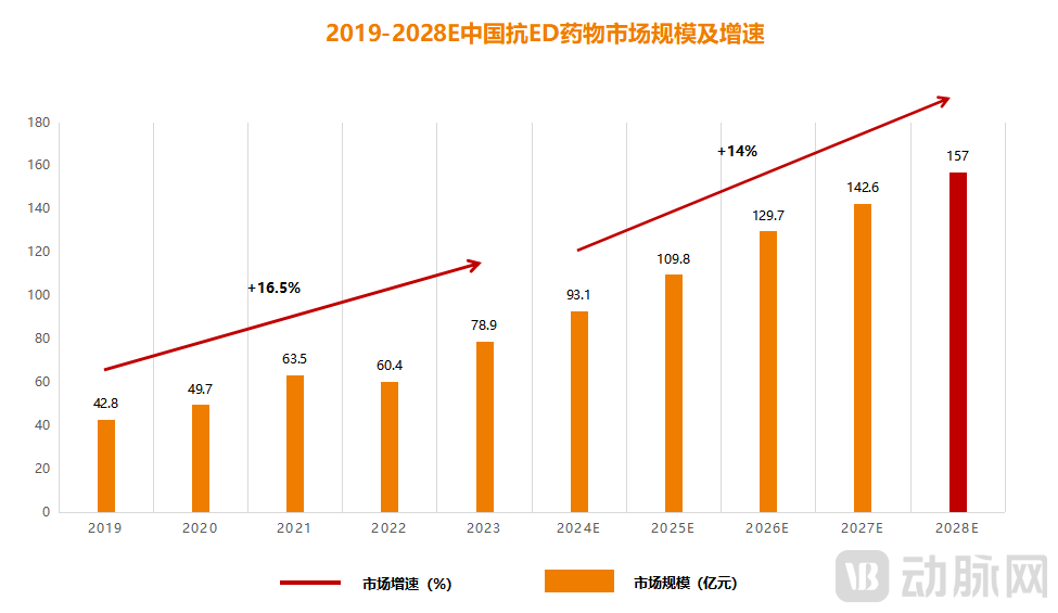 据《2024年中国抗ED药物行业白皮书》显示,2019-2023年,中国抗ED药物行业规模已从42.8亿元快速增长到78.9亿元,年复合增长率约为16.5%,预计2024-2028年将从93.1亿元进一步增长至157亿元,又一个百亿赛道即将呼之欲出。