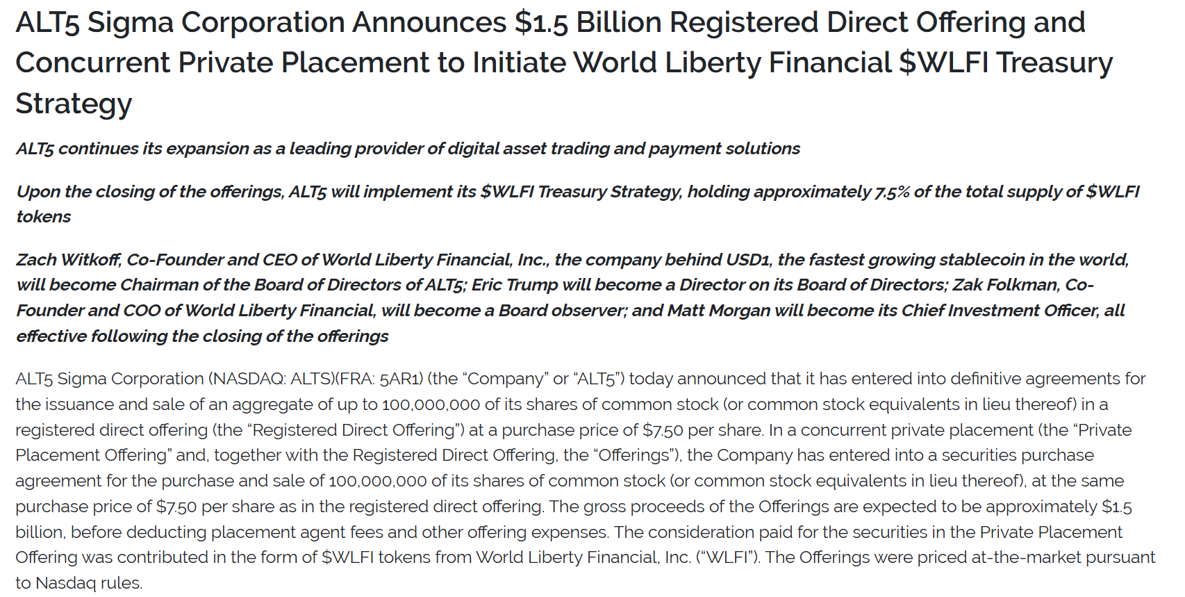 Alt5 Sigma也宣布,交易完成后上市公司将持有WLFI代币总供应量的7.5%。不过由于这款代币目前并没有上交易所,所以很难判断这块资产的净值。World Liberty此前曾表示,WLFI代币总供应量为1000亿个。
