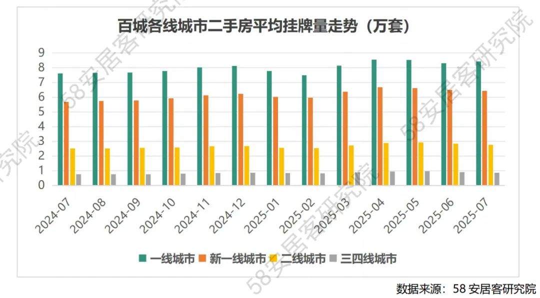 2025年7月,百城二手房挂牌量258.56万套,同比去年增长11.58%;其中: