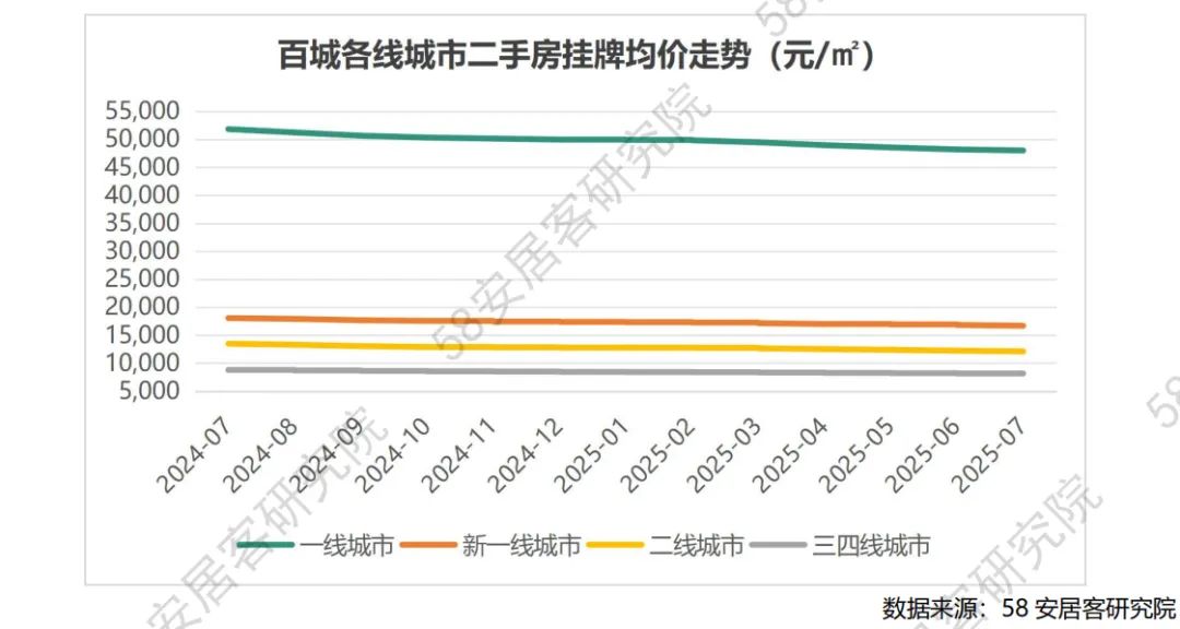 2025年7月,百城二手房挂牌均价为12140元/平方米,同比下跌8.50%;其中一线城市挂牌均价48015元/平方米,同比下跌7.36%,新一线城市挂牌均价16685元/平方米,同比下跌7.58%,二线城市挂牌均价12102元/平方米,同比下跌10.22%;三四线城市挂牌均价8090元/平方米,同比下跌8.04%。