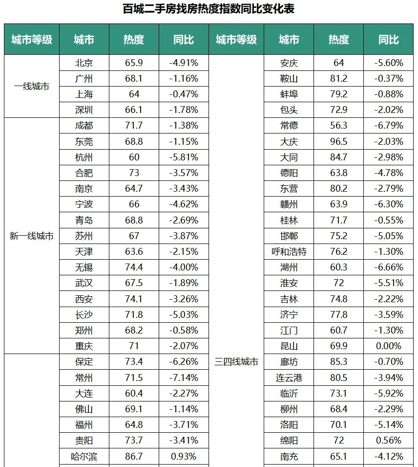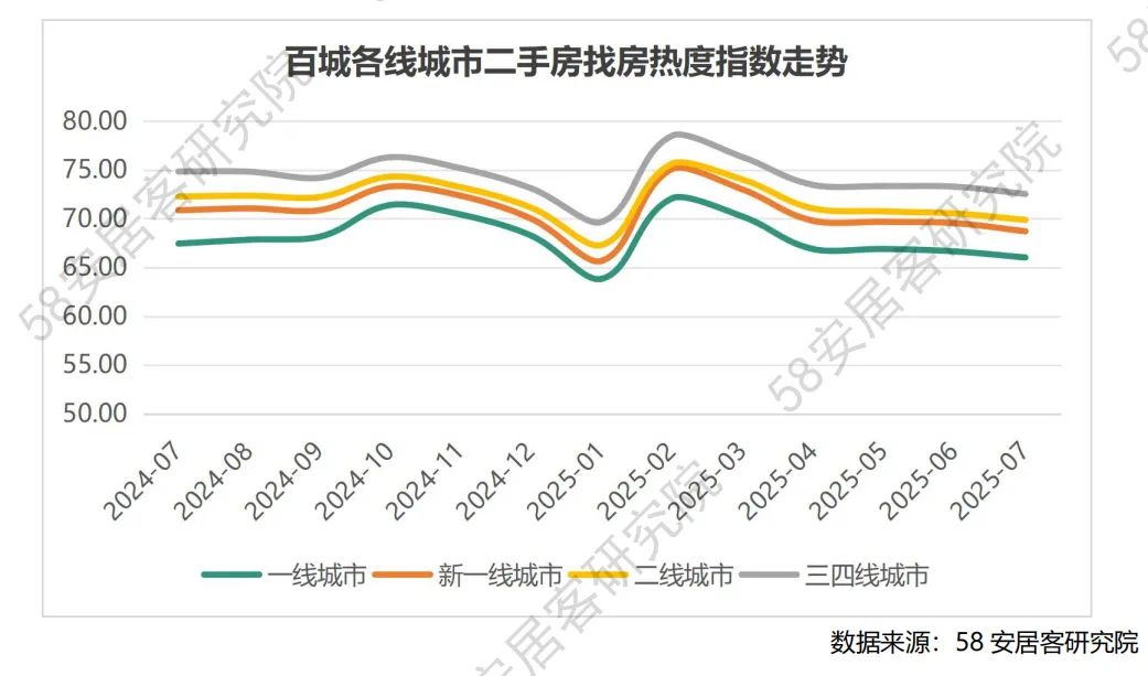 2025年7月,百城二手房找房热度指数为70.92,同比去年下跌3.11%;其中一线城市下跌2.11%,新一线城市下跌3.04%,二线城市下跌3.32%;三四线城市下跌3.07%。