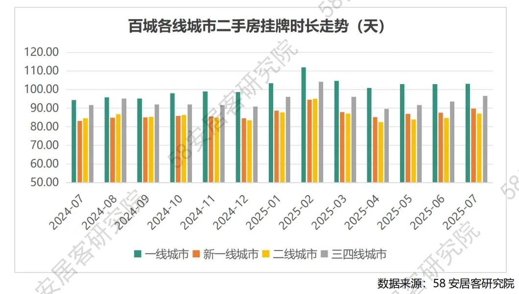 2025年7月,百城二手房挂牌时长为92.99天,同比增加5.23%;其中一线城市挂牌时长103.13天,同比增加9.18%,新一线城市挂牌时长89.74天,同比增加7.96%,二线城市挂牌时长87.07天,同比增加3.00%;三四线城市挂牌时长96.56天,同比增加增加5.40%。