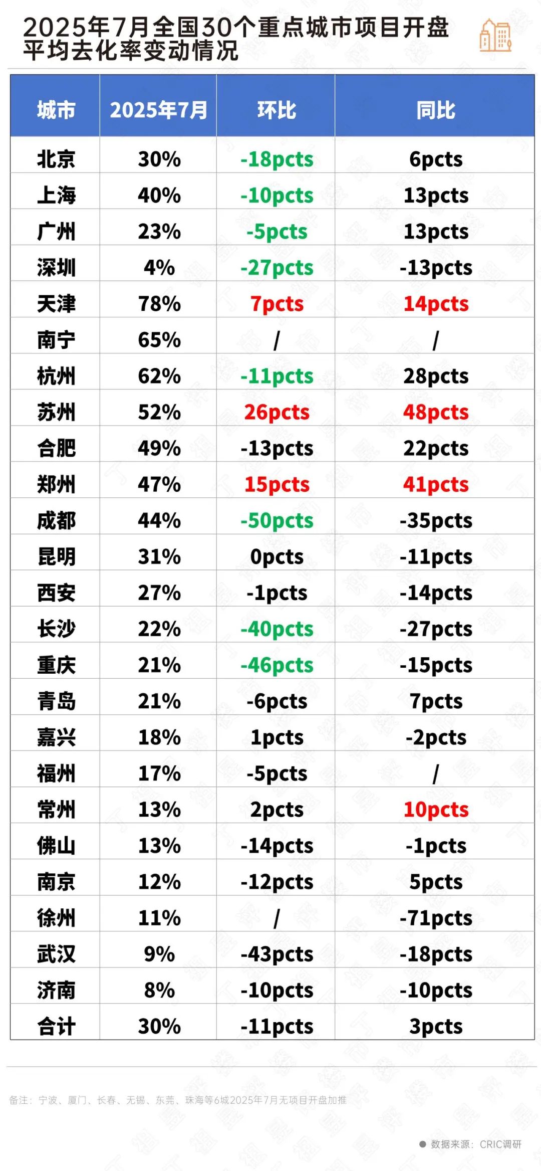 据CRIC监测数据,30个重点城市7月平均开盘去化率环比下降11个百分点至30%,降至年内新低,同比上升3个百分点,仍好于去年同期。