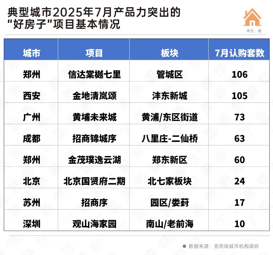通过CRIC统计的部分7月销量居前产品力突出的“好房子”项目可以看出,购房者仍在为好的产品买单,比如郑州和西安两个城市,“好房子”项目7月认购套数均超过100套。