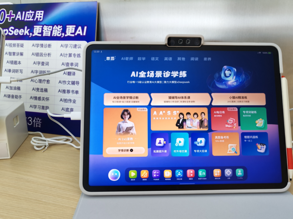 科大讯飞的学习机单价最贵,店员主要介绍的是AI能力,例如试卷诊断、个性化复习、AI智能组卷等。为了避免家长担心课程质量问题,除了AI功能,店员也会特意强调:“我们所有课程都是公立学校的老师现场录制的。”