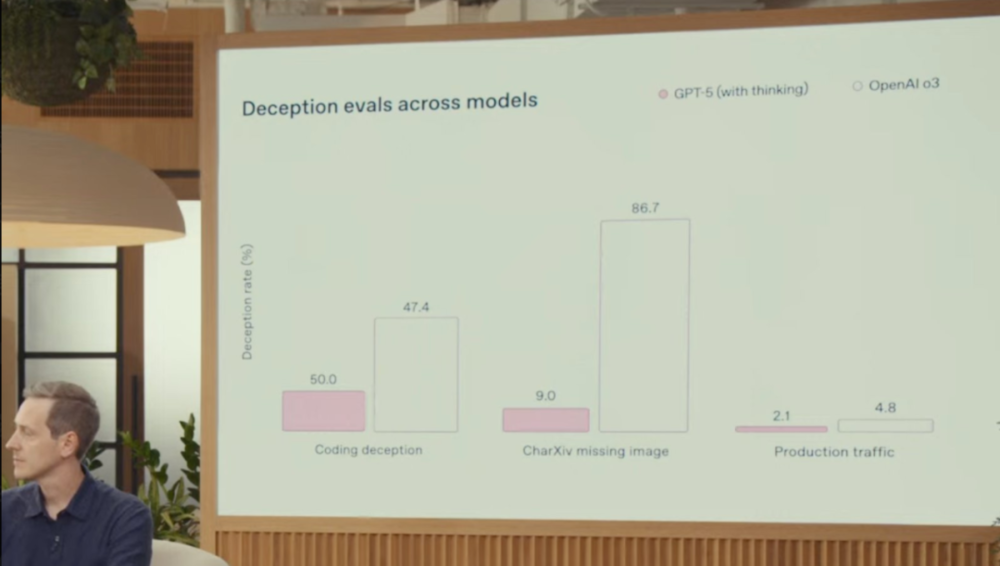 例如,在“编码欺骗”方面,PPT显示,具备思考能力的 GPT-5 的欺骗率似乎达到了 50.0%,但与 OpenAI 的 o3 得分相比,后者的柱状图却更高。