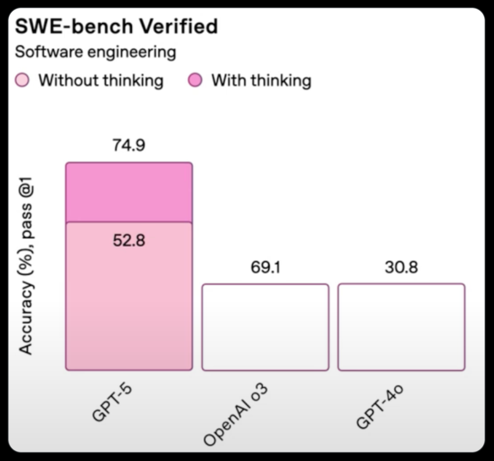 在上图中,展示了 GPT-5 的得分 52.8 低于 o3 的 69.1,但柱状图却更高。