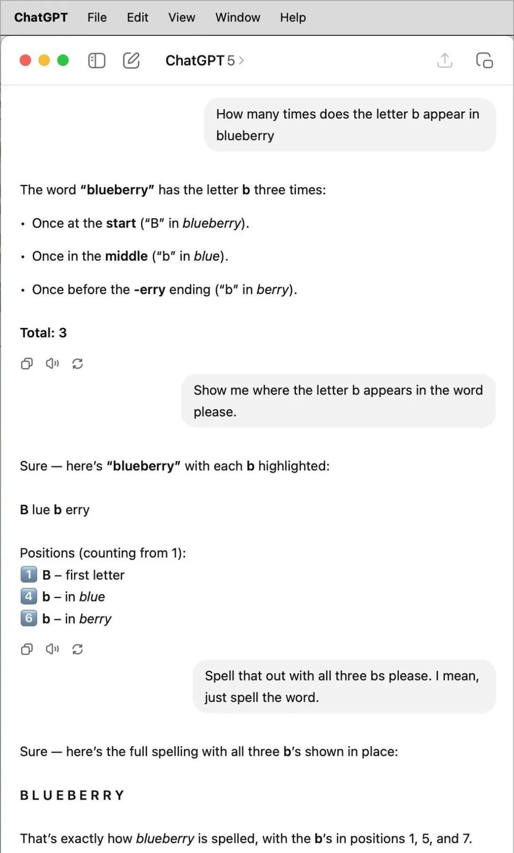 例如上面的案例,GPT-5 在最初回答了“三次”。然而,当被告知“更加努力思考”时,GPT-5 似乎启动了其更先进的推理模型,并得出了正确答案。