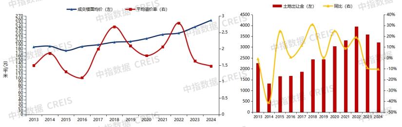 2024年,楼面均价小幅上升、溢价率明显下降,延续去年态势。其中楼面均价为258元/㎡,同比上升7.5%,主要考虑为各级城市推地质量有所上升;溢价率为1.47%,较2023年下降0.16个百分点;土地出让金为3217.98亿元,同比下降10.38%。