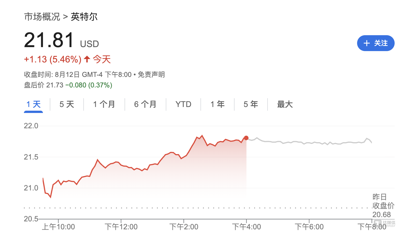 但资本市场对于英特尔股票仍处于观望摇摆状态。截至8月12日美股收盘,英特尔上涨5.46%,报21.82美元/股,盘后则转跌0.37%。今年以来,英特尔股价仅涨7.86%,最新市值954.62亿美元。