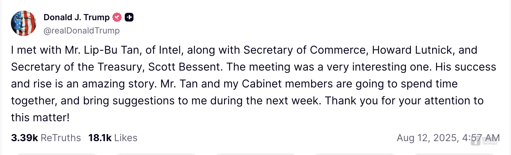 北京时间8月12日凌晨,特朗普在其自创的社交媒体平台Truth Social上发文称,他会见了英特尔华裔CEO陈立武(Lip-Bu Tan),以及与美国商务部部长霍华德·卢特尼克(Howard Lutnick)和财政部部长斯科特·贝森特(Scott Bessent)见面。