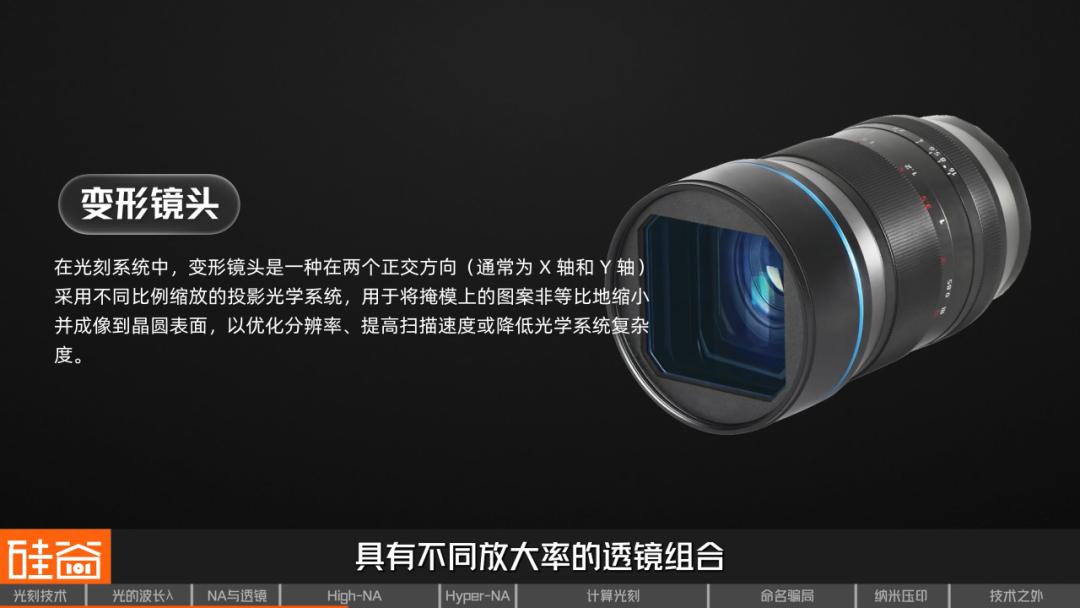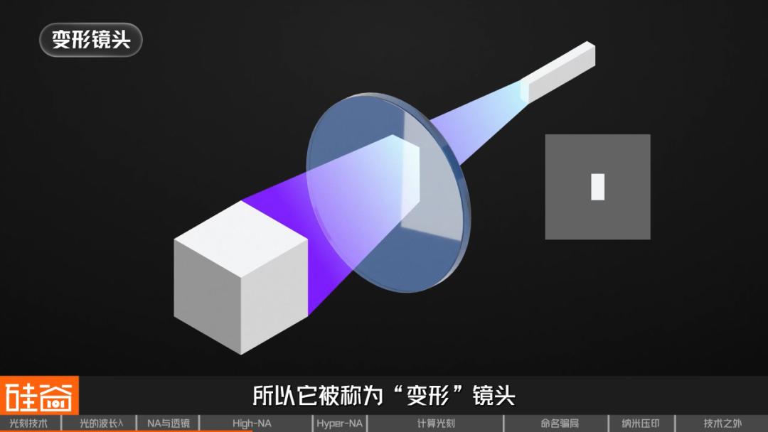 变形镜头是水平与垂直方向具有不同放大率的透镜组合,比如在水平方向上压缩8倍,提高有效分辨率,在垂直方向只压缩4倍,来补偿景深损失,降低光刻胶不平整度带来的误差。