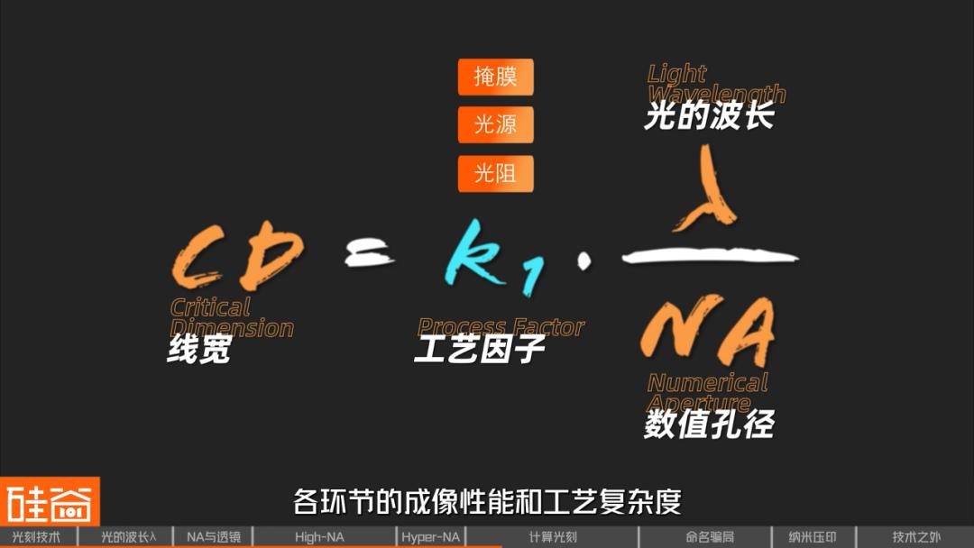 在ASML各地办公室的墙上,你都可以看到这样一条公式:CD等于K1乘以λ除以NA,这就是瑞利判据(Rayleigh Criterion),决定了光刻机的分辨率上限,也意味着要缩小芯片制程,要么降低K1和λ、要么提高NA。