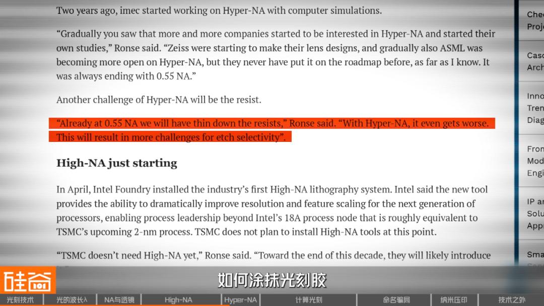 比如与ASML合作开发光刻机的Imec先进图案化项目总监Kurt Ronse表示,在High-NA时,就已经将晶圆上的光刻胶涂抹的更薄了,到Hyper-NA时,如何涂抹光刻胶也将会是更大的挑战。