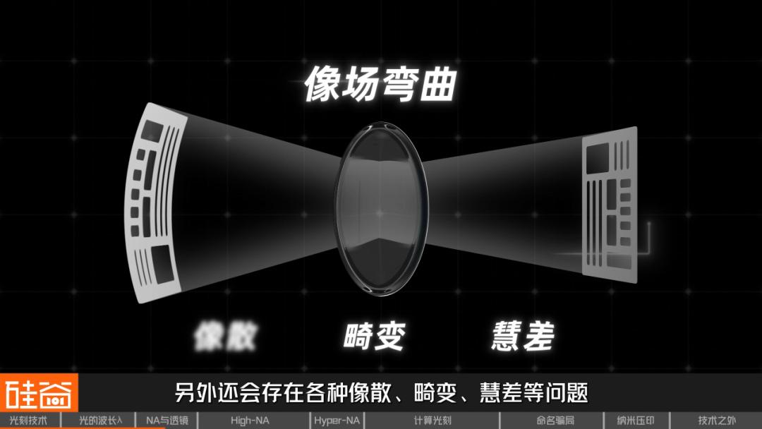 你可能会疑惑,既然一个凸透镜就能完成光线的聚焦,为什么光刻机中需要那么多透镜呢?简单来说,因为球面镜存在像场弯曲的现象,导致成像打到晶圆上时会被扭曲。