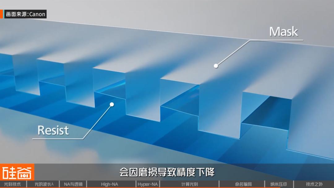第一是模板成本高。传统光刻的掩膜板比实际电路大了4倍,制造成本相对较低,而纳米压印需要1:1的模板,制造难度极大。同时,由于模板会与光刻胶和晶圆直接接触,会因磨损导致精度下降,需要频繁更换,这也带来了更高的生产成本。