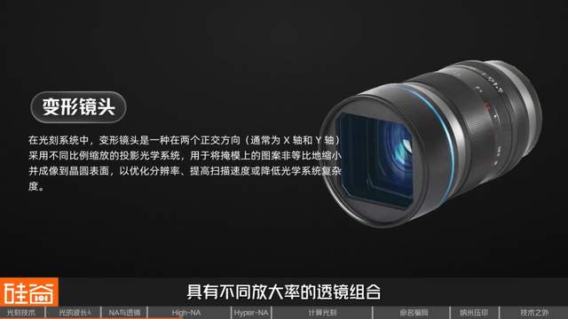 变形镜头是水平与垂直方向具有不同放大率的透镜组合,比如在水平方向上压缩8倍,提高有效分辨率,在垂直方向只压缩4倍,来补偿景深损失,降低光刻胶不平整度带来的误差。