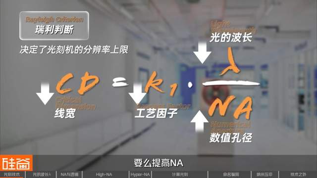 在ASML各地办公室的墙上,你都可以看到这样一条公式:CD等于K1乘以λ除以NA,这就是瑞利判据(Rayleigh Criterion),决定了光刻机的分辨率上限,也意味着要缩小芯片制程,要么降低K1和λ、要么提高NA。