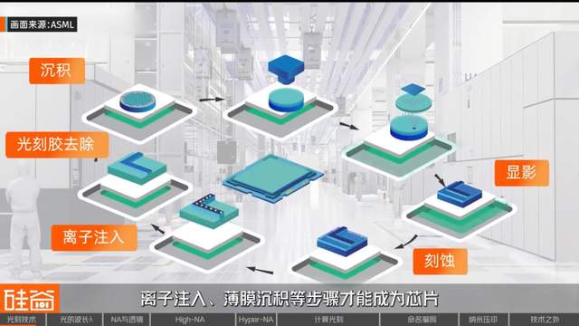 当然芯片制造的流程远不止光刻这一步,光刻胶被照射后会硬化,后续还要经过显影、刻蚀、光刻胶去除、离子注入、薄膜沉积等步骤才能成为芯片。