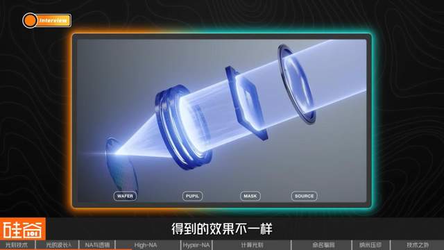 举例来说,光刻机基本的概念是把它的掩膜,进行一个缩小倍数。他们之所以没有选择一个更大的(NA)参数去做,并不是说光学系统本身做不到,而是如果当它的(NA)倍数过大的时候,(掩膜图案)它缩小得过于小,会引起其他一些系统参数的下降。如果它的放大倍数过大的时候,或者说它的NA相差过大的时候,它的景深变得过小,那么当它芯片的上下有一点点波动,放置的位置有一点波动,或者光刻胶的厚度比较厚的时候,它会造成高一点和低一点的地方得到的效果不一样,这就会造成系统其他级别的误差。