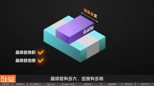 在28nm之前,芯片上的晶体管都是这样的平面结构,那时命名的方式,以晶体管的栅极长度(Gate Length)为准,这样大家就能大致判断晶体管有多大、密度有多高,这也对应着芯片的性能。