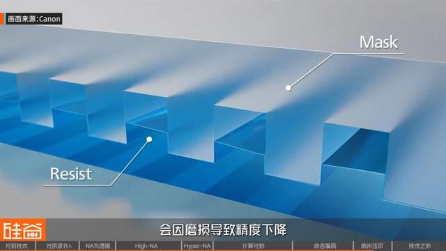 第一是模板成本高。传统光刻的掩膜板比实际电路大了4倍,制造成本相对较低,而纳米压印需要1:1的模板,制造难度极大。同时,由于模板会与光刻胶和晶圆直接接触,会因磨损导致精度下降,需要频繁更换,这也带来了更高的生产成本。