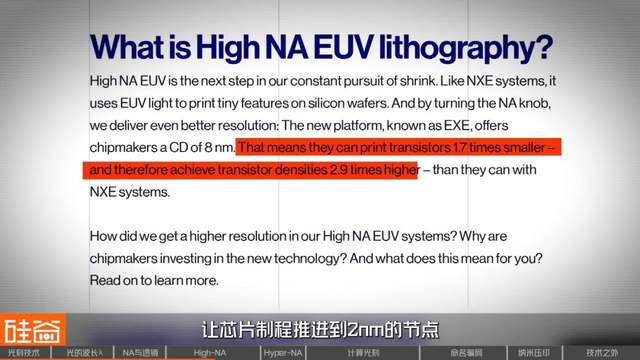 ASML官方宣称,High-NA相比第一代的Low-NA EUV,将光刻机的CD从13nm降低到了8nm,打印的晶体管大小可以缩小1.7倍,让芯片制程推进到2nm的节点。
