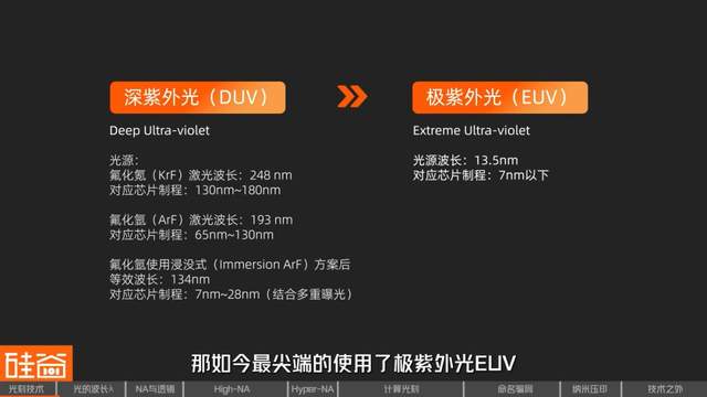 大家经常听到的“EUV”、“DUV”光刻机,是按照使用光源的波长来分类的。上一代光刻机采用深紫外光(DUV),如今最尖端的使用了极紫外光(EUV)。