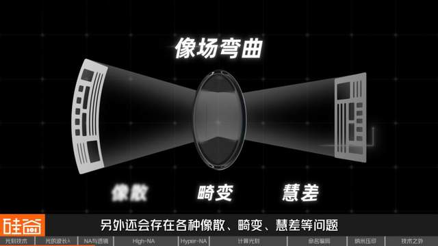 你可能会疑惑,既然一个凸透镜就能完成光线的聚焦,为什么光刻机中需要那么多透镜呢?简单来说,因为球面镜存在像场弯曲的现象,导致成像打到晶圆上时会被扭曲。