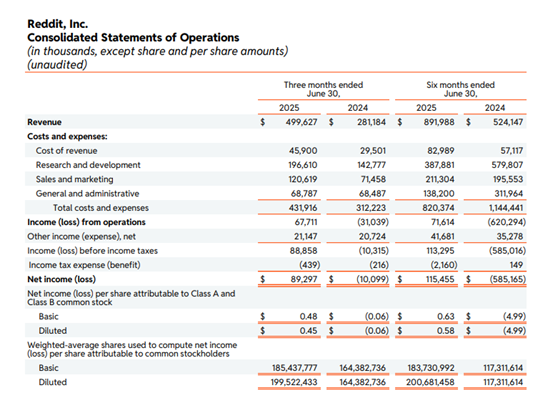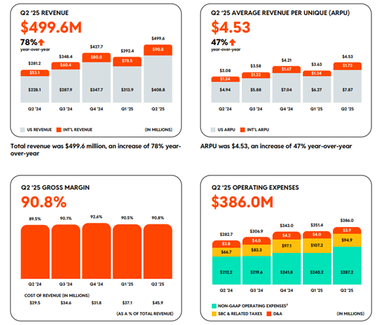 进入2025财年,Reddit在第二季度表现亮眼,实现营收4.996亿美元,同比增长78%,毛利率达90.8%。GAAP 净利润8,930万美元(净利率18%),调整后EBITDA 1.667亿美元(利润率33%)。DAUq(日活跃独立用户)为1.104亿,同比增长21%,ARPU为4.53美元,同比增长47%。
