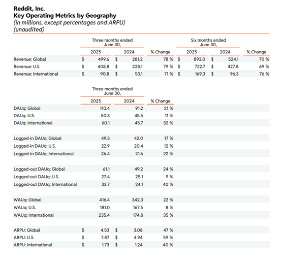 Reddit 在2025财年Q2交出极为亮眼的广告业绩:营收5亿美元,同比增长78%,其中广告收入4.65亿美元,同比飙升84%,占总收入的93%。这不仅源于广告主数量的提升(同比+50%),也得益于广告单价的显著提高——ARPU 达到4.53美元,同比增长47%。