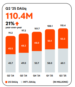 Q2 Reddit 的日活跃独立用户达1.104 亿,同比增长21%;周活跃用户4亿,同比增长22%。虽然环比增速有所放缓(约2%),但 Reddit 在“基于兴趣、与陌生人高质量交流”的社交细分领域几乎没有直接替代者。
