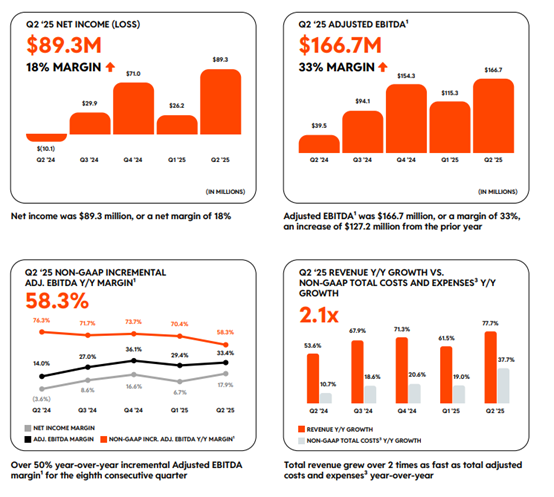 自由现金流为1.108 亿美元,资本开支占比不足 0.1%,体现出轻资产、高毛利的业务特征。公司预计 2025 年第三季度营收在5.35–5.45亿美元之间,调整后EBITDA在1.85–1.95亿美元之间,延续高增长与高利润率趋势。