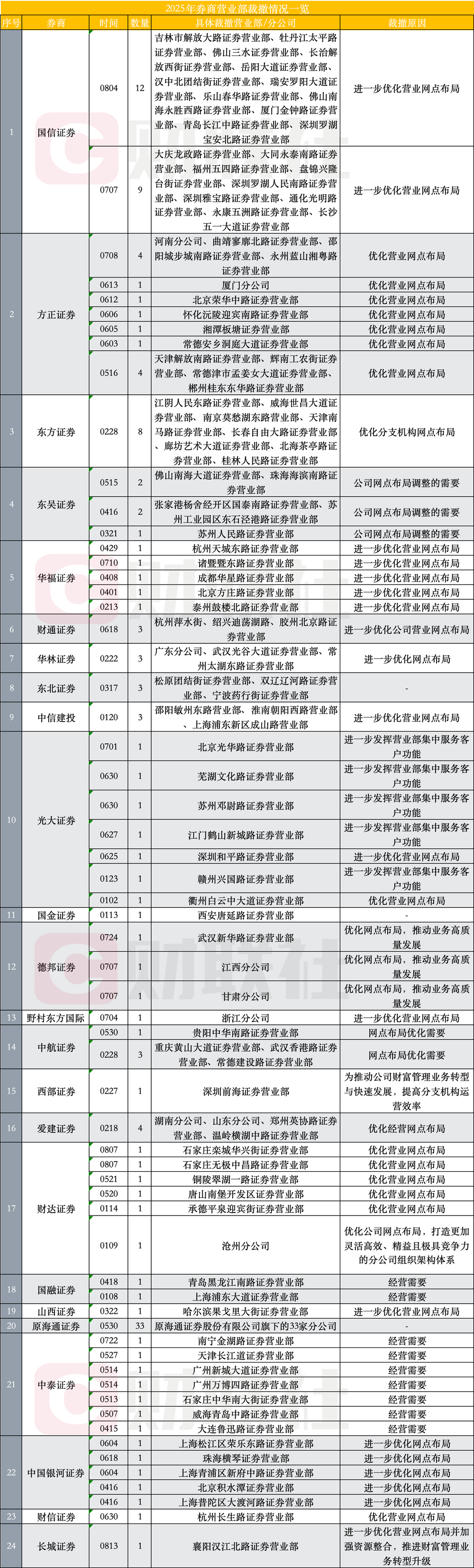 据不完全统计,截止8月上旬,已有20余家券商在全国范围内公告撤销营业部和分公司,合计裁撤网点超百家。其中,国信证券以一次性集中撤销12家营业部创下目前年内单次裁撤数量新高,理由为“进一步优化营业网点布局”;方正证券、东方证券、光大证券等多家机构,也在短时间内连续发布撤并公告。