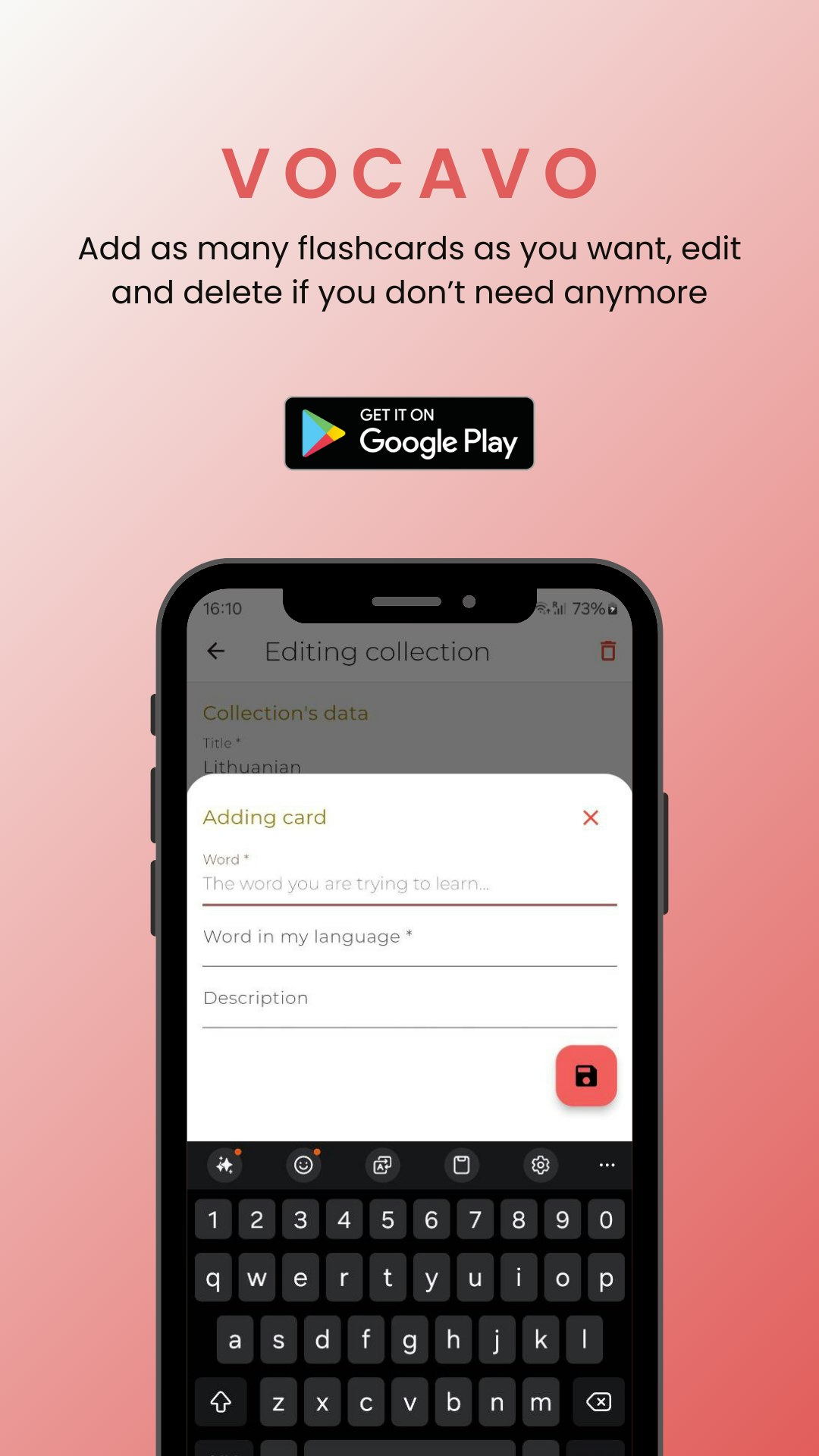 Vocavo, expand your vocabulary effortlessly!Improve your language prowess with collection lists and custom flashcards.Whether you're a language enthusiast or want to improve your language skills, Vocavo is your go-to app to lear and master new words!
