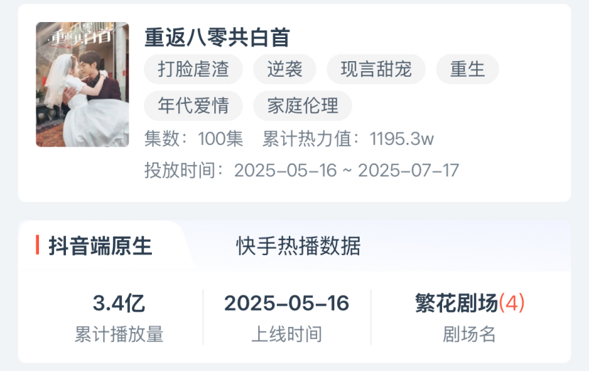 腾讯视频的《重返八零共白首》融合了当下流行的重生、换嫁、认亲、商战、逆袭等多种爆款元素,上线后多次登顶DataEye 短剧热力榜,收获热力值1195.32w(近似充值额)。