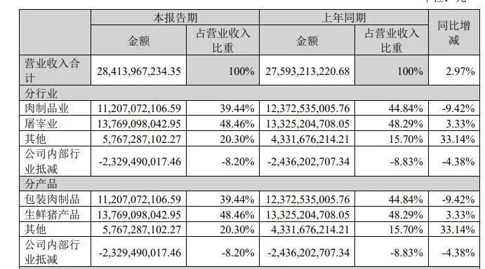 具体来看,今年上半年,双汇的营收增长来源于屠宰业及其他这两大板块。屠宰业板块的营收同比增长3.33%至137.69亿元,营收占比小幅提升至48.46%。