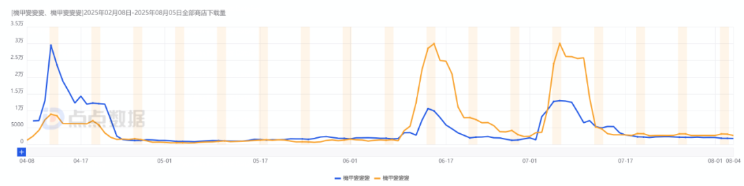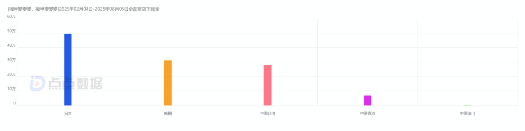 点点数据显示,《机甲变变变》的下载量在游戏每次上线新市场时都有明显上升,区别在于上线日本时苹果商店下载量高于谷歌商店,而上线韩国与港澳台时情况则相反。