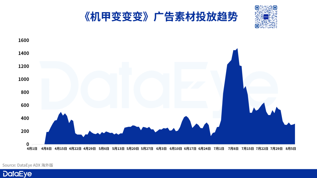DataEye-ADX海外版数据显示,《机甲变变变》虽然在上线日韩时均有明显的广告投放上升趋势,但其投放量级都比不上上线港澳台时期——游戏在7月前两周日均投放素材超1000组,可见其对港澳台市场的重视。